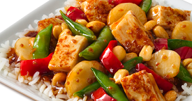 Kung Pao Chicken – Classic Chinese Dish.  Boneless breast of chicken, tri color bell peppers and sweet onion served in a spicy sauce.   Garnished with toasted peanuts.